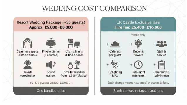 A resort bundle for roughly 30 guests often lands around £5,000–£8,000, while unlocking a UK castle can start at £6,400 before you pay for a single canapé.
