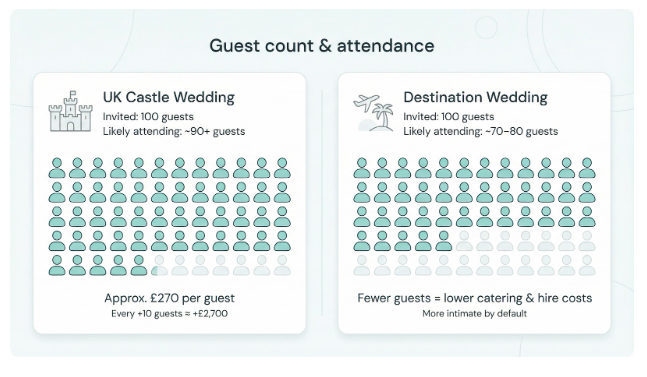 Guests face a different equation. At home, an aunt from Manchester covers fuel and a modest B&B, joining the party for under £100. Ask her to fly overseas and she sees a package-holiday price. Most guests fund their own travel, and many welcome the sun break, yet long-haul tickets naturally trim the list and move expenses away from the couple.