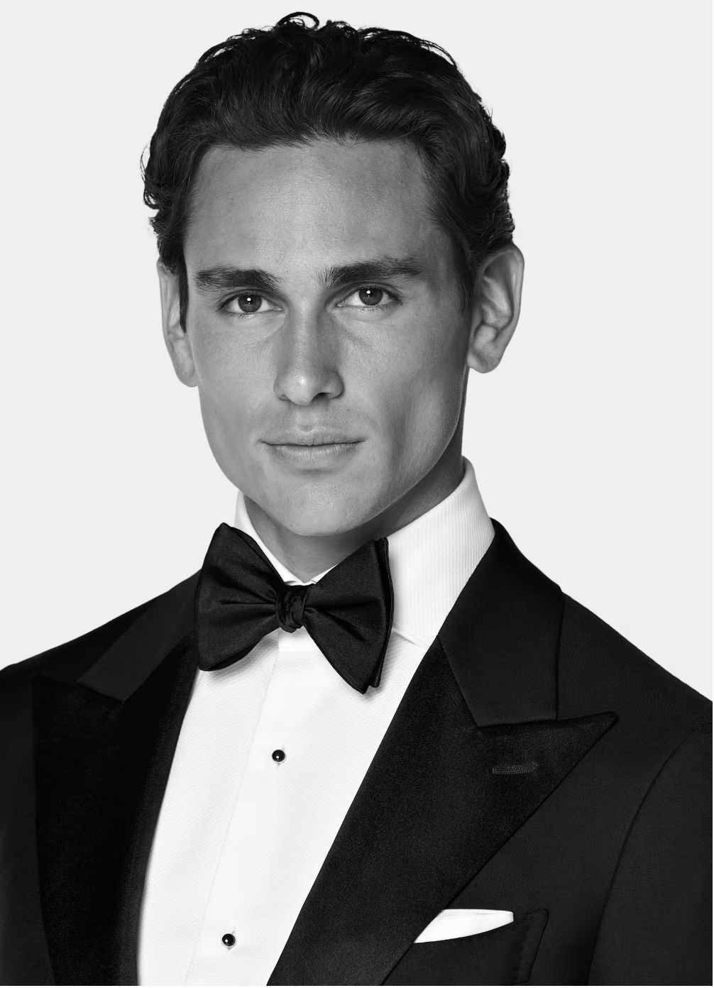 Every element of the tuxedo contributes to its signature refinement. The jacket features satin or grosgrain lapels, often in a shawl or peak design, while matching trousers include a satin stripe down the side. The look is completed with a crisp white shirt, a black bow tie and polished patent leather shoes. Together, these components create a seamless and timeless aesthetic.